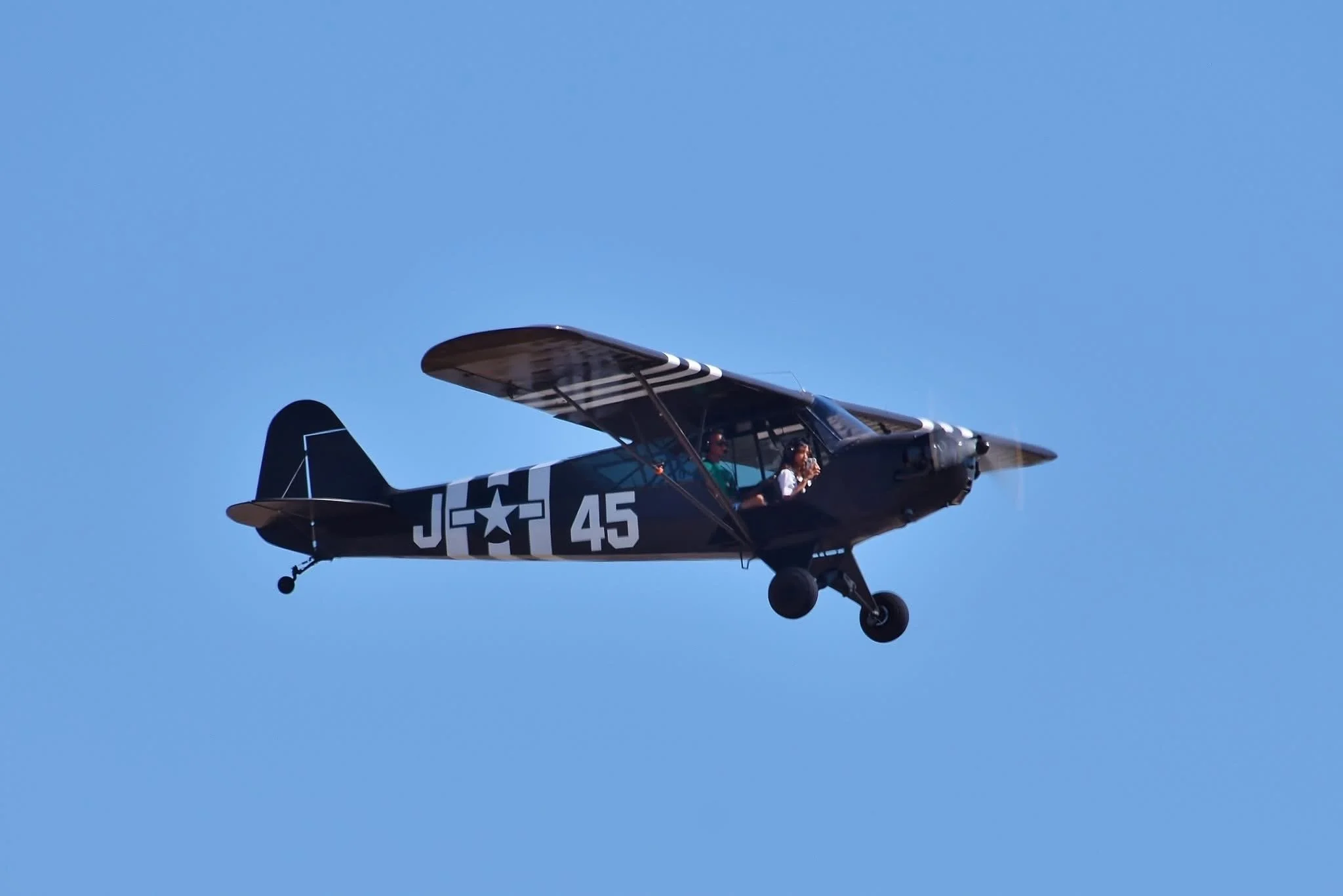 Happy passenger flying into history on the Piper L-4 Grasshopper