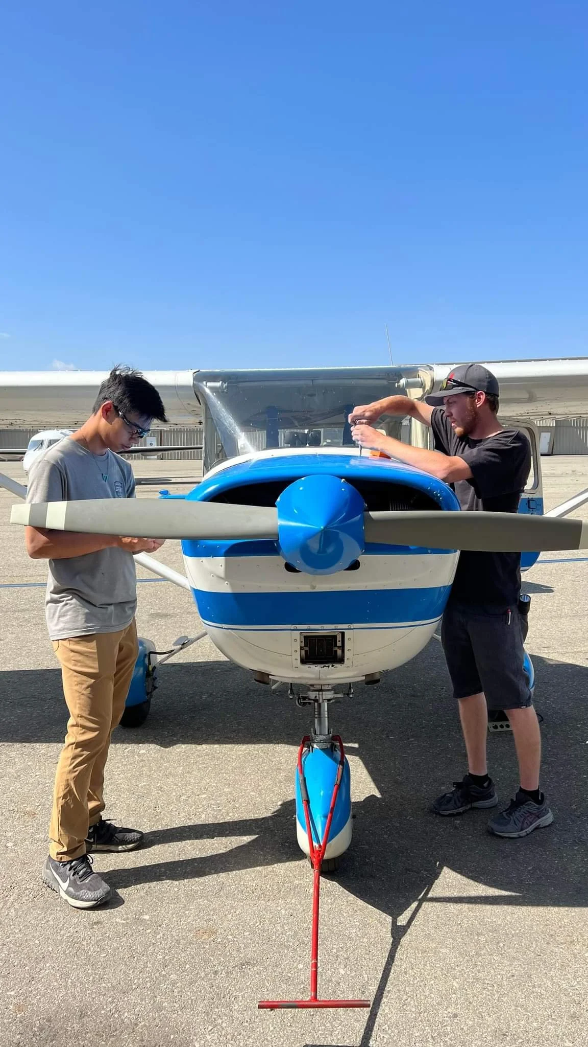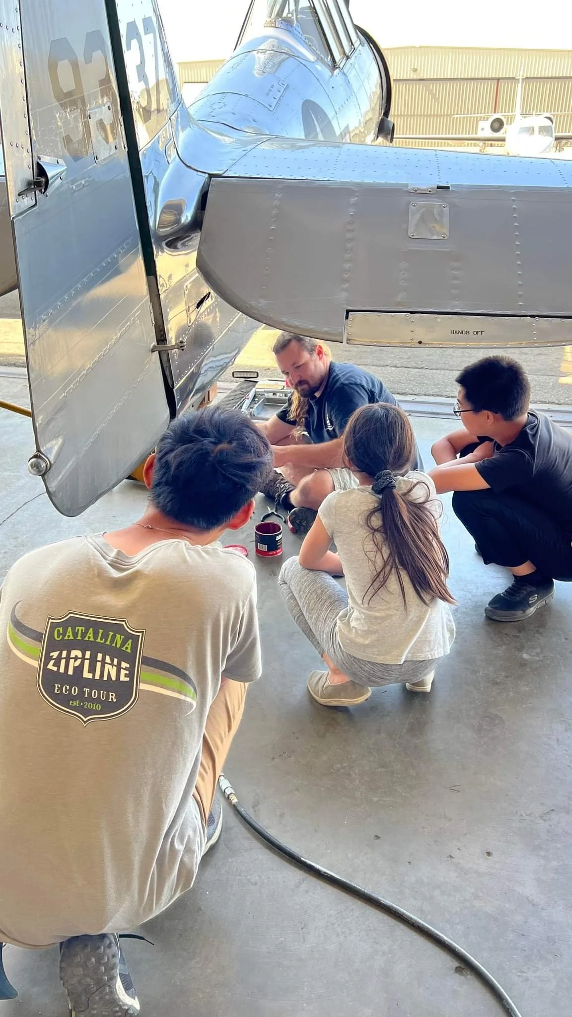 The champ was prepped for paint, with all of the tail feathers painted silver by the crew. The paint looked fantastic. Fabric repairs were also conducted on the tail of the airplane, with many of us learning about fabric application for the first time under the expertise of Matt. We also got the electrical system reinstalled in the airplane, and finished complying with the ADs. Fabric work was done on the wings to cover up the new inspection holes. The fuel tank was also removed for repairs. Maintenance was performed on the stearman, 150, and luscombe. Several people went flying throughout the day. Tiphani also passed the 1000 hour milestone flying the luscombe! Joanna took the controls of a plane for the first time. Saturday evening ended with dinner and a movie, we all watched top gun in preparation for the new movie coming out.